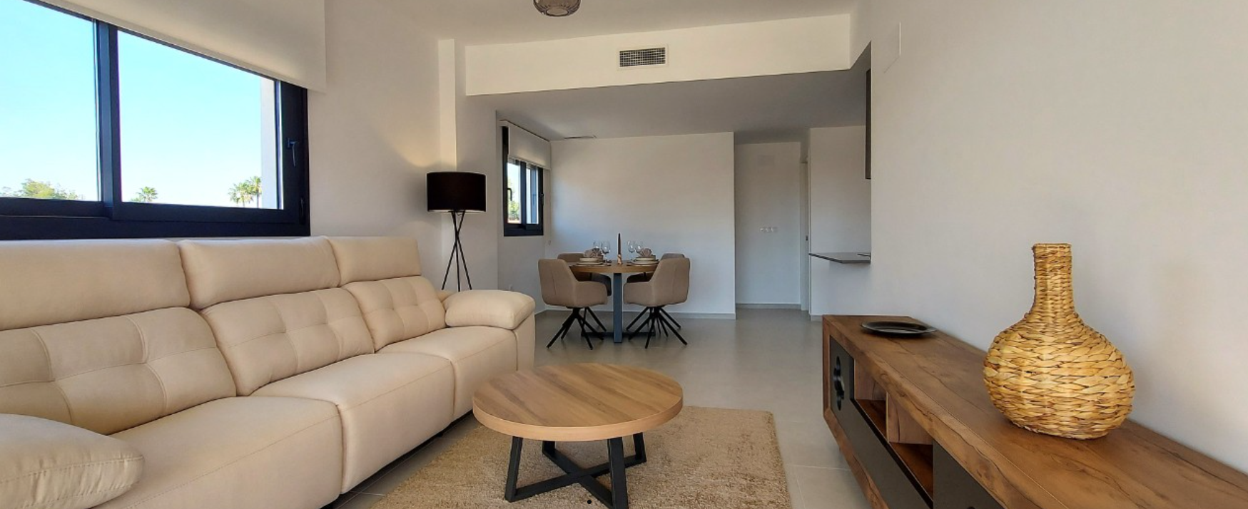 We have a Residential construction called: Residencial Sol de Salinas that consists of 5 apartment blocks with 2 and 3 bedroom flats surrounded by a large communal garden of almost 10,000 m². We offer a tour of a show flat that will give you an idea of the flats inside the new construction.
